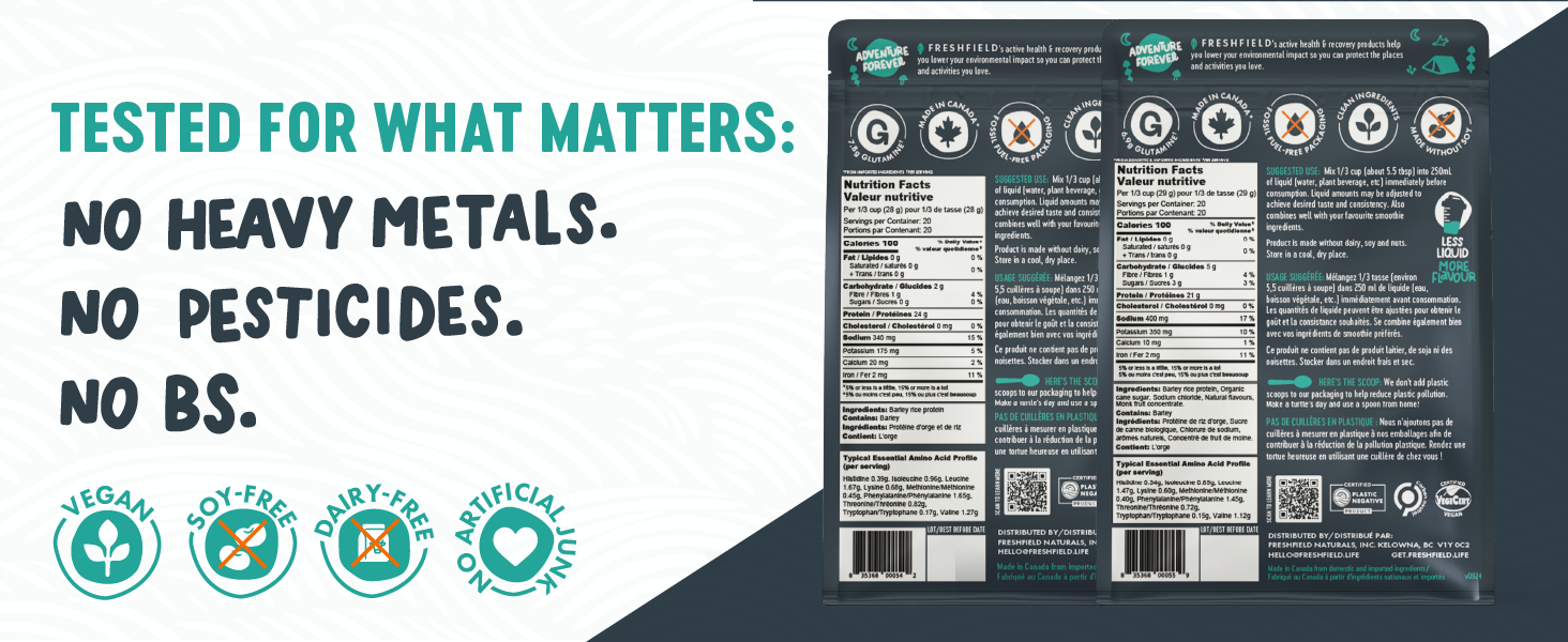 Vanilla: Barley rice protein, organic cane sugar, sodium chloride (salt), natural flavours, monk fruit concentrate.